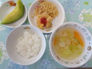 27日の給食は『鶏肉のチーズピカタ・パスタソテー・野菜スープ・メロン』でおやつは『梅ひじきおにぎり・麦茶』でした🐔