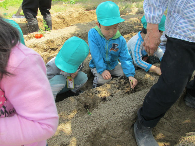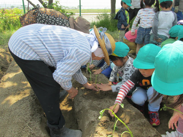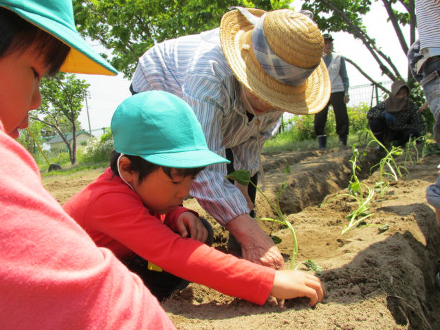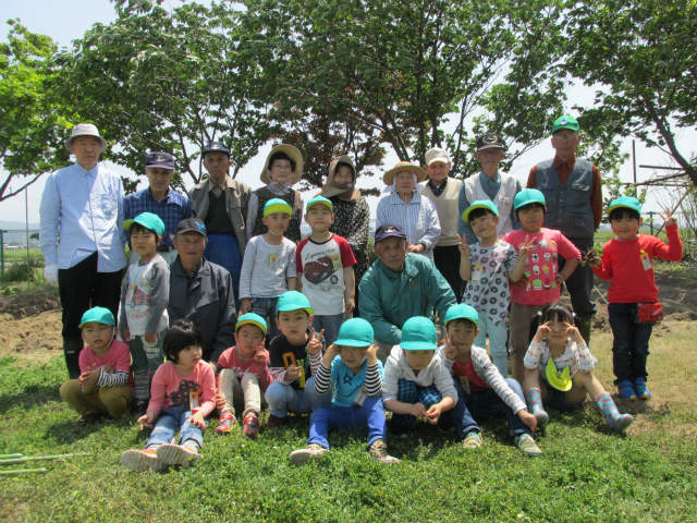 5月14日(木)、野菜の苗植えをしました北平田地区の老人クラブの方々に、畑作りから手伝っていただき、苗の植え方も教えていただきましたよ
