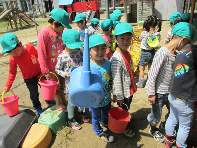 そして、みんなで水やりです水道には長蛇の列が… 「おっきいジョウロでいっぱいお水をかけてあげるぞ」