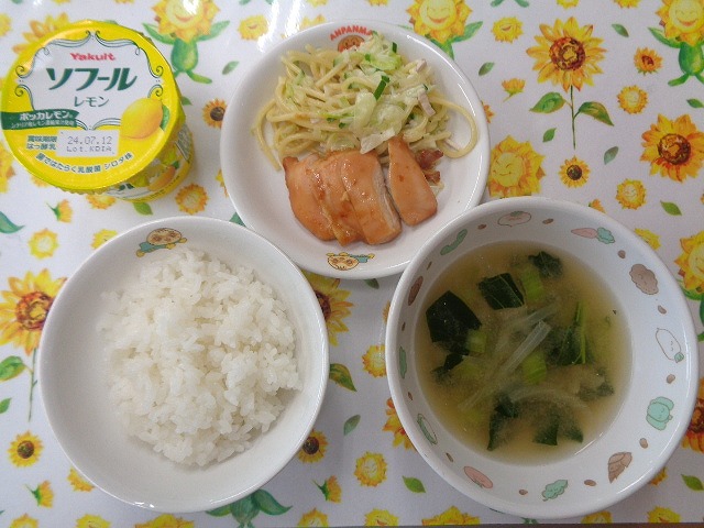 1日の給食は『照り焼きチキン・パスタサラダ・みそ汁(小松菜・玉ねぎ)・ヨーグルト』でした🐔