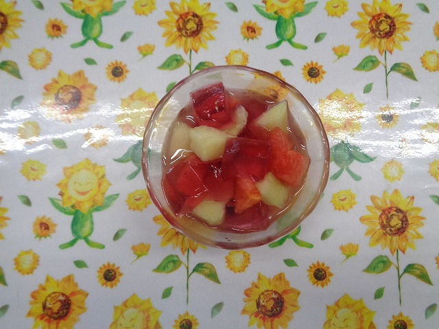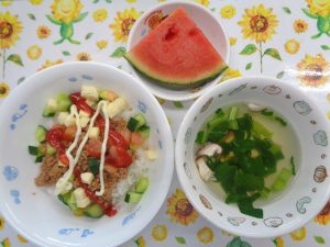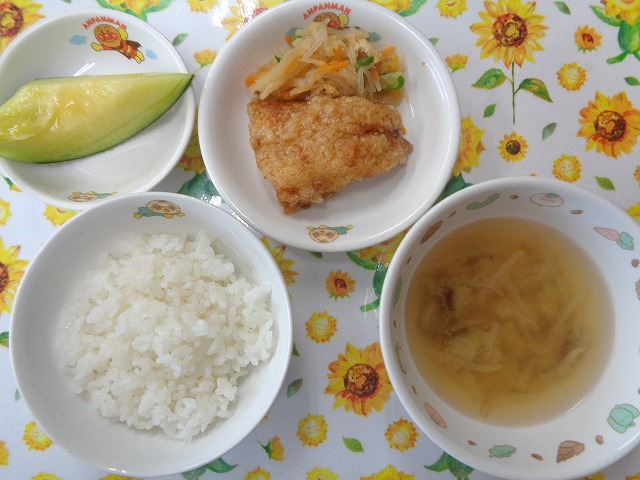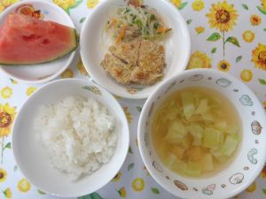 12日の給食は『鶏のパン粉焼き・春雨サラダ・みそ汁(キャベツ・厚揚げ)・すい』でした🍉