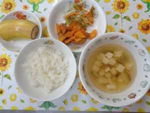 3日の給食は『ウインナーのみそ炒め・ゆかり和え・すまし汁(なす・豆腐)・バナナ』で