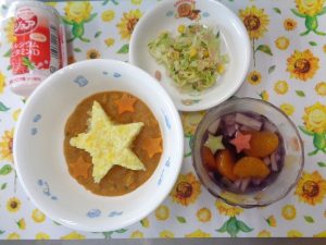 5日の給食は『お星さまカレー・ツナサラダ・ジョア・ゼリーポンチ』でした🎋