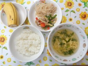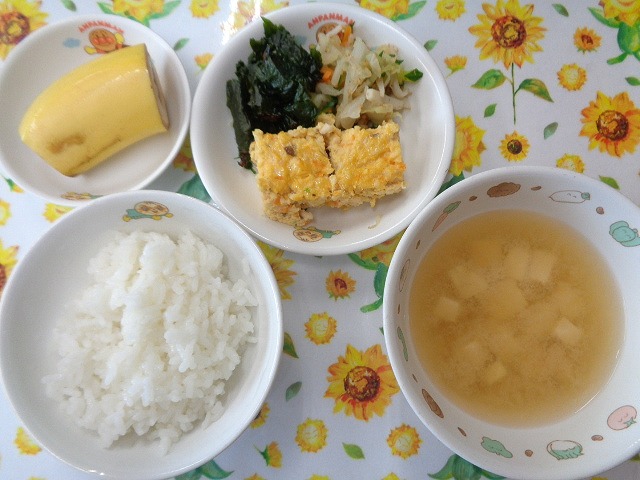 29日の給食は『五目卵焼き・和え物・しそ巻き・みそ汁(えのき・豆腐)・バナナ』でした🍌