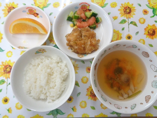 9日の給食は『ごはん・鶏のバーベキューソース・コロコロサラダ・みそ汁(キャベツ・薄揚げ)・オレンジ』で、おやつは『ホットケーキ・牛乳』でした🐔