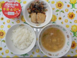10日の給食は『さばのみそ焼き・ひじきの炒り煮・豚汁・ヨーグルト』で、おやつは『焼きおにぎり・麦茶』でした🐟