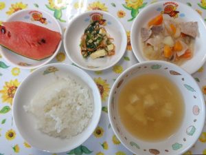 16日の給食は『肉じゃが・ほうれん草の納豆和え・みそ汁(豆腐・葱)・すいか』でした🍉