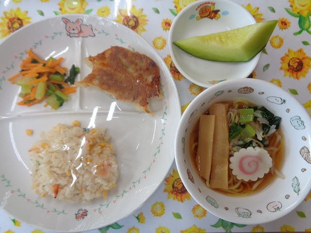 17日の給食は『チャーハン・餃子・チンゲン菜の和え物・冷やしミニラーメン・メロン』で、おやつは『ジャムサンド(いちご)orチーズ蒸しパン・牛乳』でした(^^)/