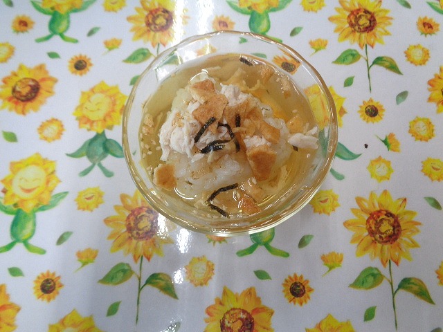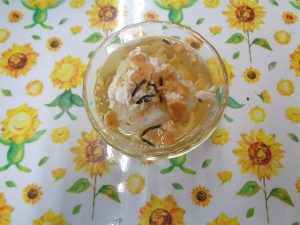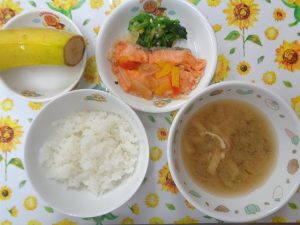 18日の給食は『鮭の南蛮漬け・オクラの和え物・みそ汁(ナス・薄揚げ・麩)・バナナ』で、おやつは『冷やし茶漬け』でした🐟