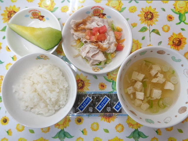 19日の給食は『冷しゃぶごまだれ・味付けのり・すまし汁(えのき・豆腐・ねぎ)・メロン』でした🍈