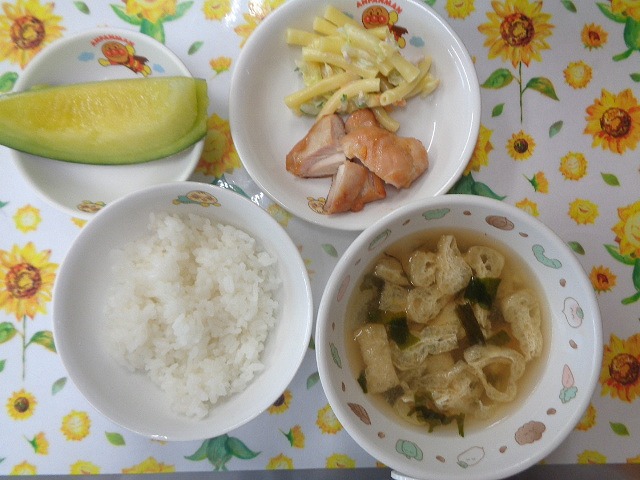 22日の給食は『鶏のマーマレード焼き・マカロニサラダ・みそ汁(玉ねぎ・わかめ・薄揚げ)・メロン』でした🐔