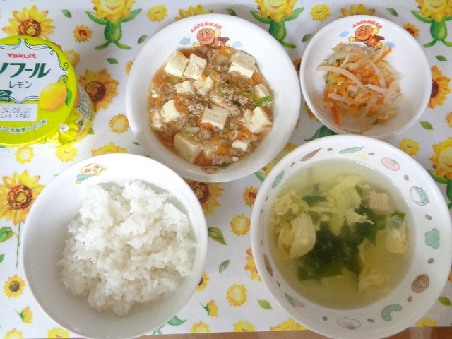 23日の給食は『麻婆豆腐・華風和え・卵スープ・ヨーグルト』で、おやつは『トマトミートパイ・麦茶』でした