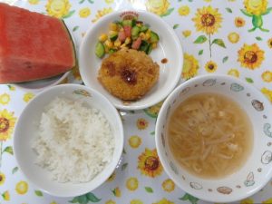 30日の給食は『かぼちゃコロッケ・コロコロサラダ・みそ汁(薄揚げ・もやし)・すいか』で、おやつは『ゼリーポンチ』でした🍉