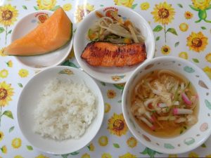 31日の給食は『ごはん・焼き魚・五目きんぴら・冷やしうどん・メロン』で、おやつは『夏野菜ピザトースト・牛乳』でした🐟