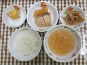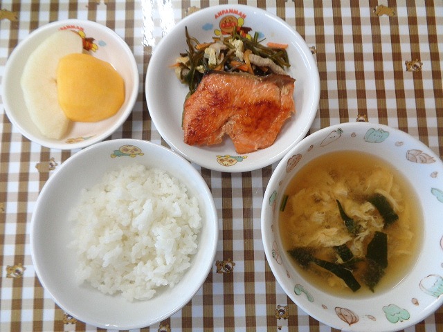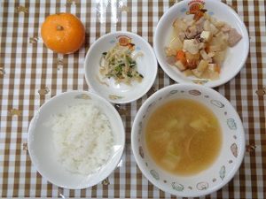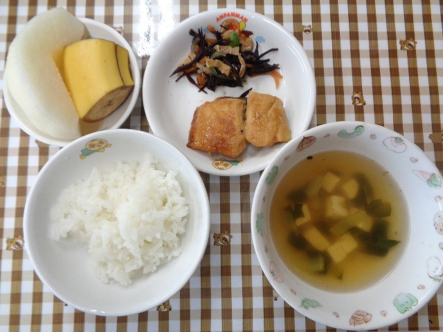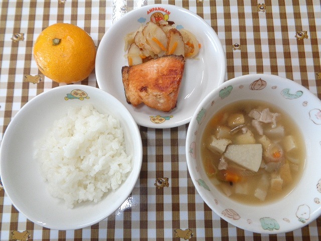 1日の給食は『焼き魚・切り干し大根煮・芋煮汁・みかん』でした🍊