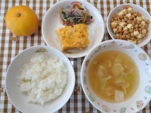 5日の給食は『五目卵焼き・菊の醤油なめこ和え・チーズ納豆・みそ汁(キャベツ・ほうれん草)・みかん』でした🍳