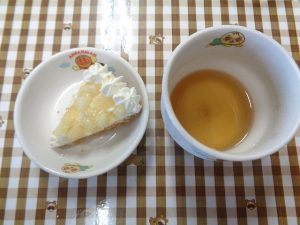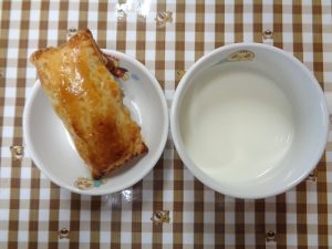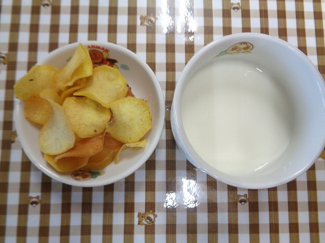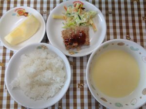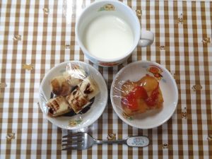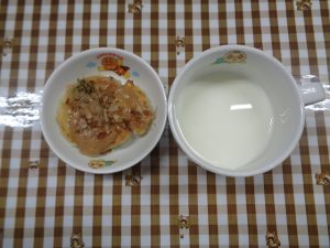 21の給食は『チーズピカタ・ツナサラダ・みそ汁(かぼちゃ・玉ねぎ)・ヨーグルト』で、おやつは『お茶漬け風』でした🐔