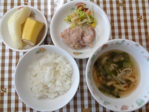 11日の給食は『鶏肉の塩麹焼き・白菜サラダ・みそ汁(大根・小松菜・焼き麩)・洋梨・バナナ』でした🐔