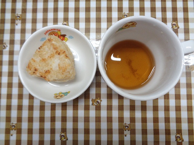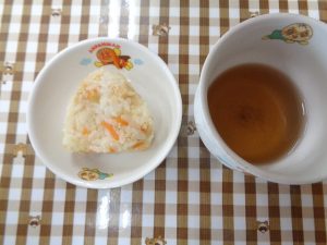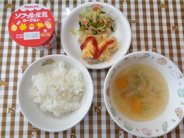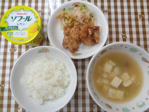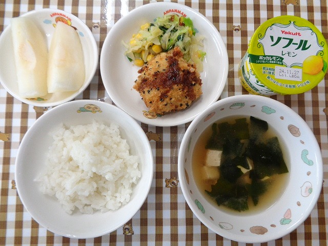 27日の給食は『ごはん・鶏の唐揚げ・大根サラダ・なめこ汁・ヨーグルト』で、おやつは『焼きおにぎり・麦茶』でした🐔