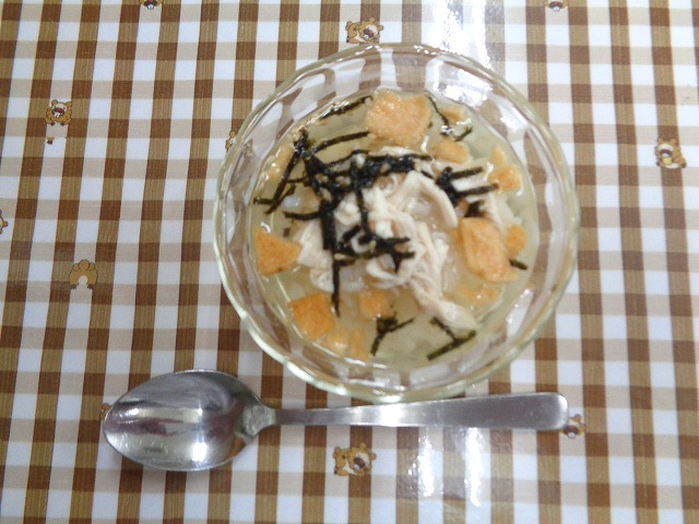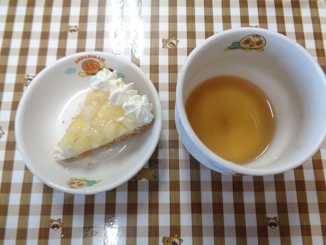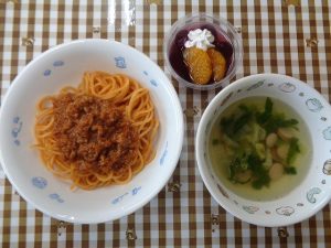 13日の給食は『ミートソーススパゲッティ・コンソメスープ・ゼリーアラモード』で、おやつは『ケーキ・麦茶』でした🍰