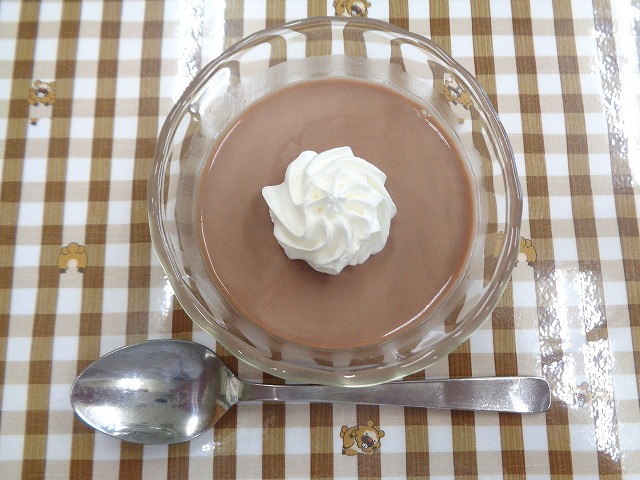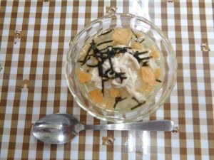 14日の給食は『鮭の醤油漬け焼き・すき昆布煮・かきたま汁・洋梨・柿』で、おやつは『ココアプリン』でした🍮