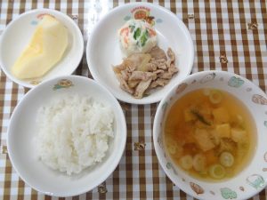 15日の給食は『豚肉の生姜焼き・ポテトサラダ・みそ汁(厚揚げ・ねぎ)・りんご』でした🐷