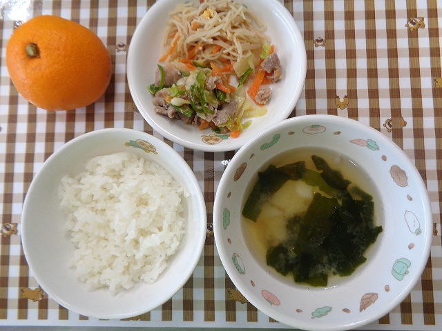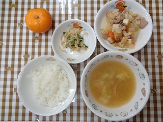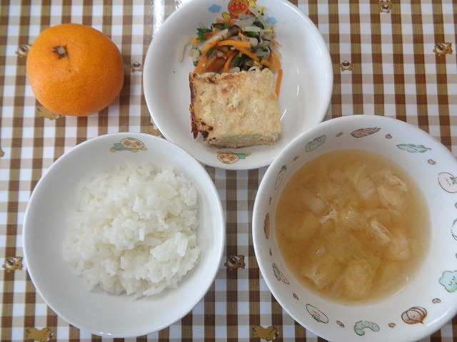 25日の給食は『つくね焼き・磯香あえ・みそ汁(白菜・薄揚げ)・みかん』でした🍊