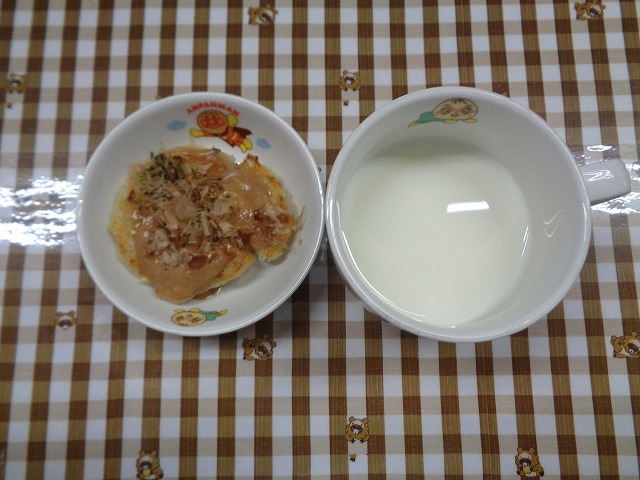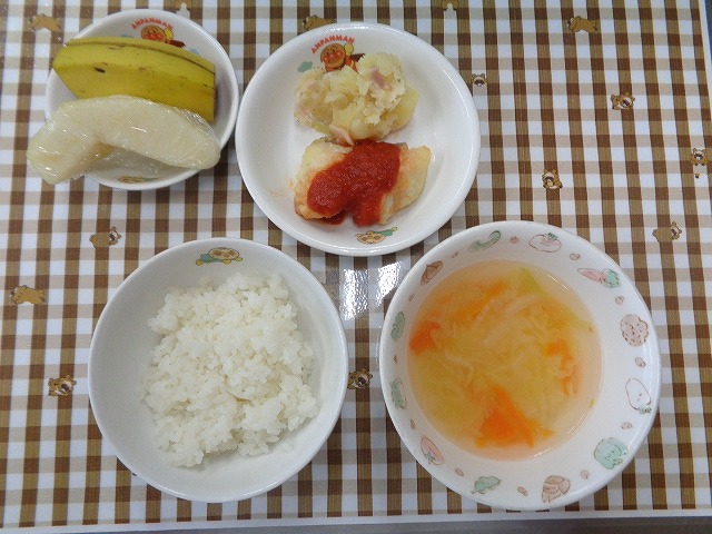 19日の給食は『白身魚のトマトソースがけ・ジャーマンポテト・白菜スープ・バナナ』で、おやつは『お好み焼き・牛乳』でした🍌