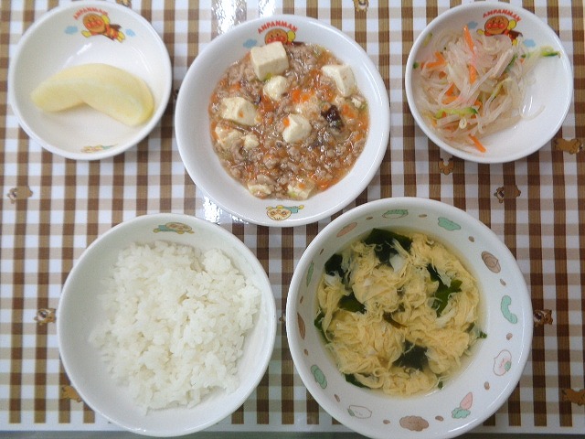 22日の給食は『麻婆豆腐・春雨サラダ・たまごスープ・りんご』でした🍎