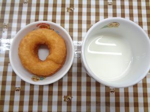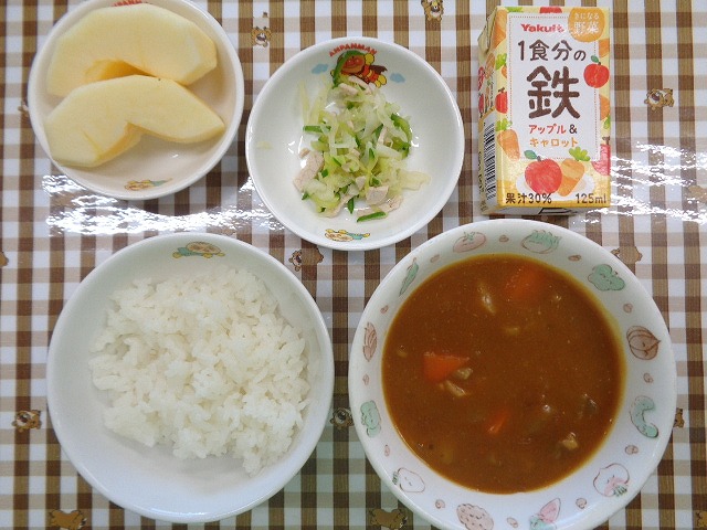 26 日の給食は『秋のカレー・ハムサラダ・野菜ジュース・りんご』で、おやつは『ドーナツ・牛乳』でした🍩