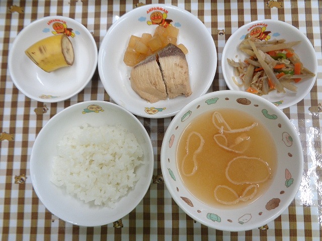 28日の給食は『ぶり大根・五目きんぴら・みそ汁(えのき・焼き麩)・バナナ』で、おやつは『きのこクリームパイ・牛乳』でした🐟