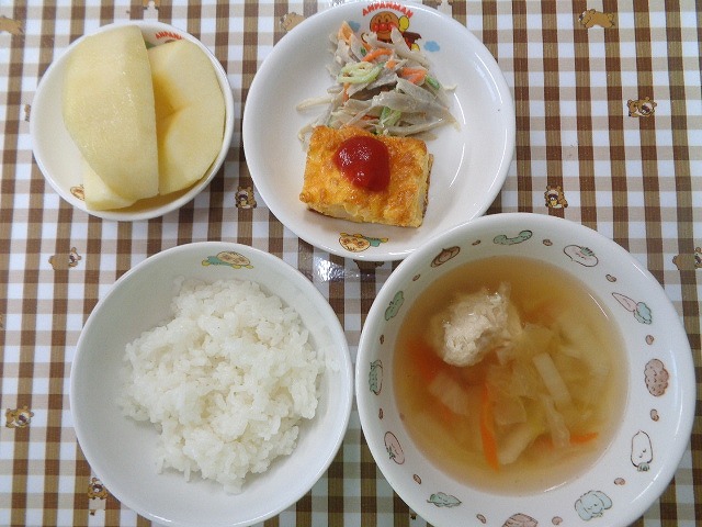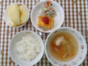 29日の給食は『スペイン風オムレツ・ごぼうサラダ・鶏だんご汁・りんご』でした🐔
