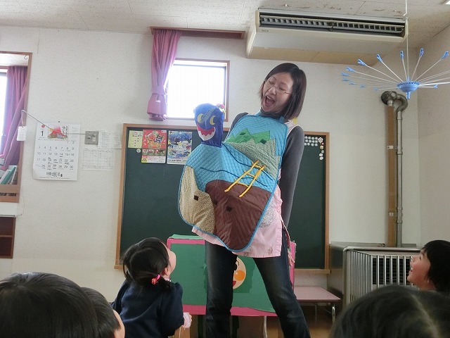 はじめに「三匹のやぎのがらがらどん」のエプロンシアターを楽しみましたよfuku02.gifhana-ani01.gif