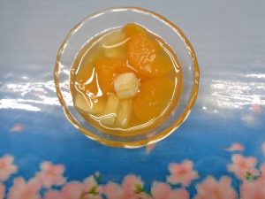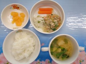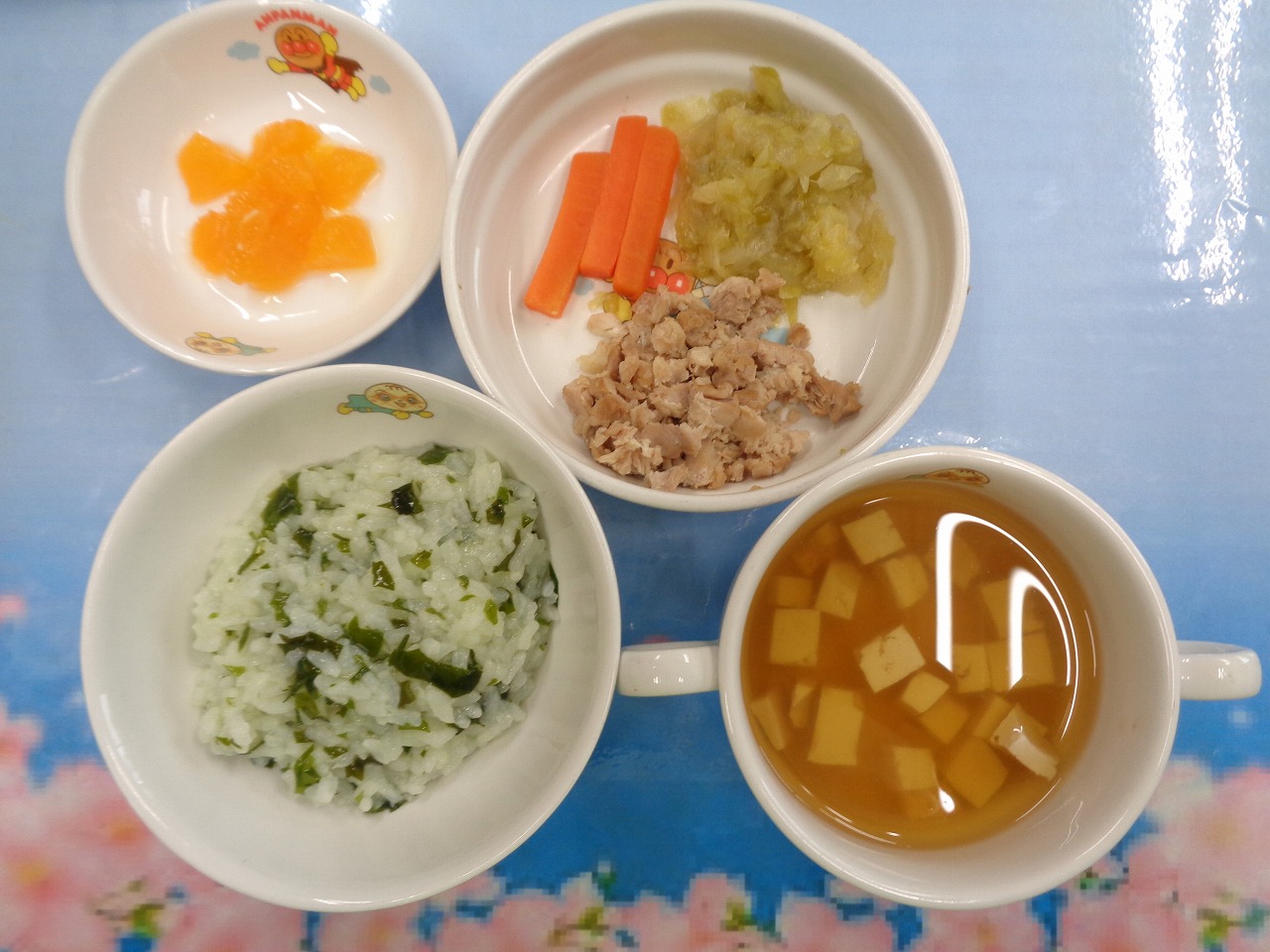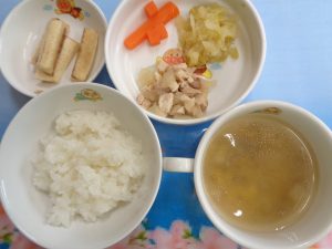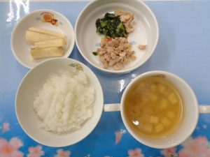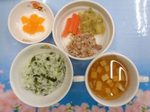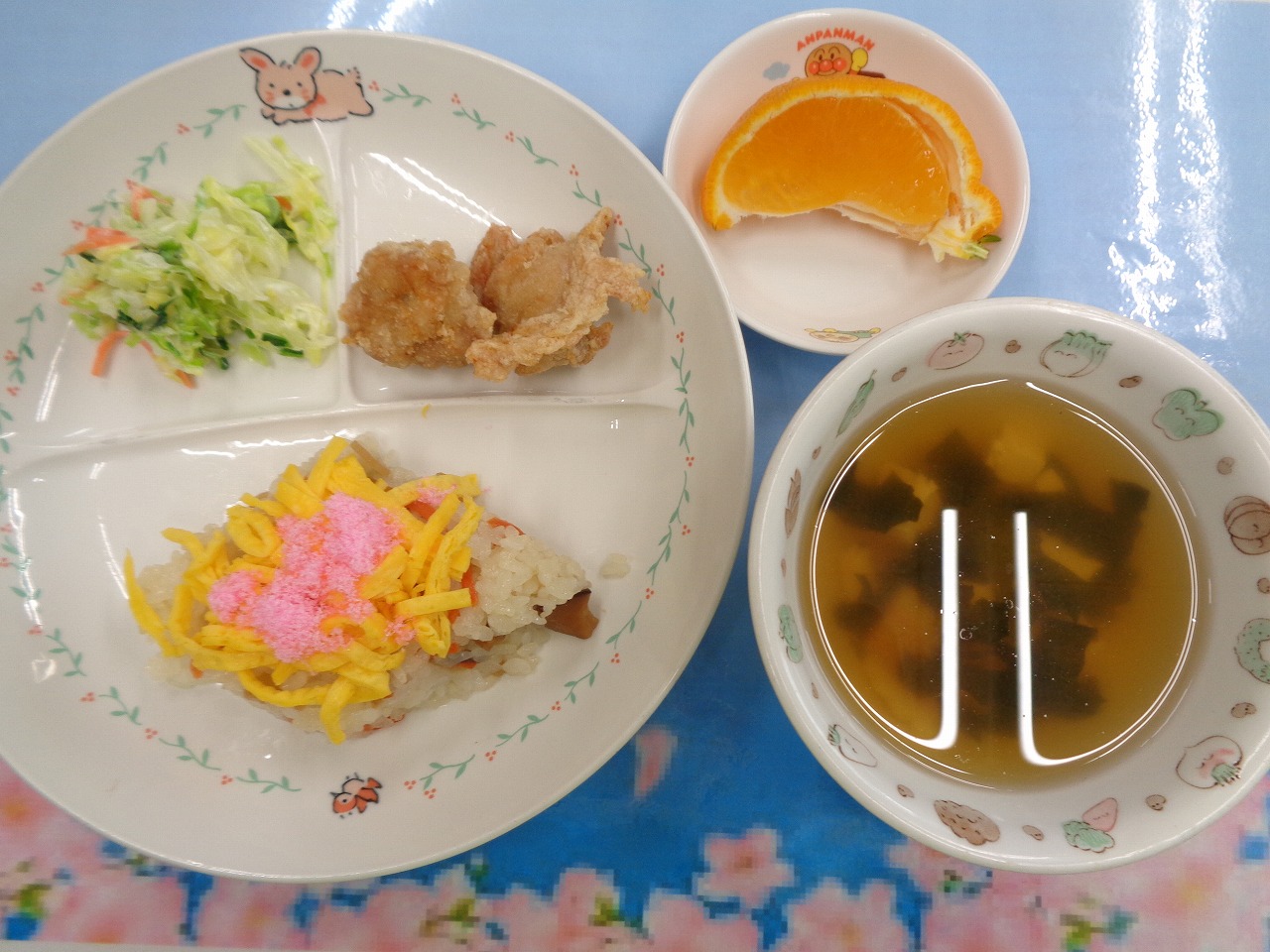 3日の給食は『ひなちらし・鶏肉の塩から揚げ・菜の花和え・すまし汁』で、おやつは『ひなあられ・カルピス』でした🎎