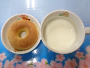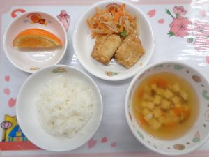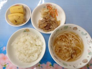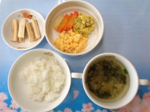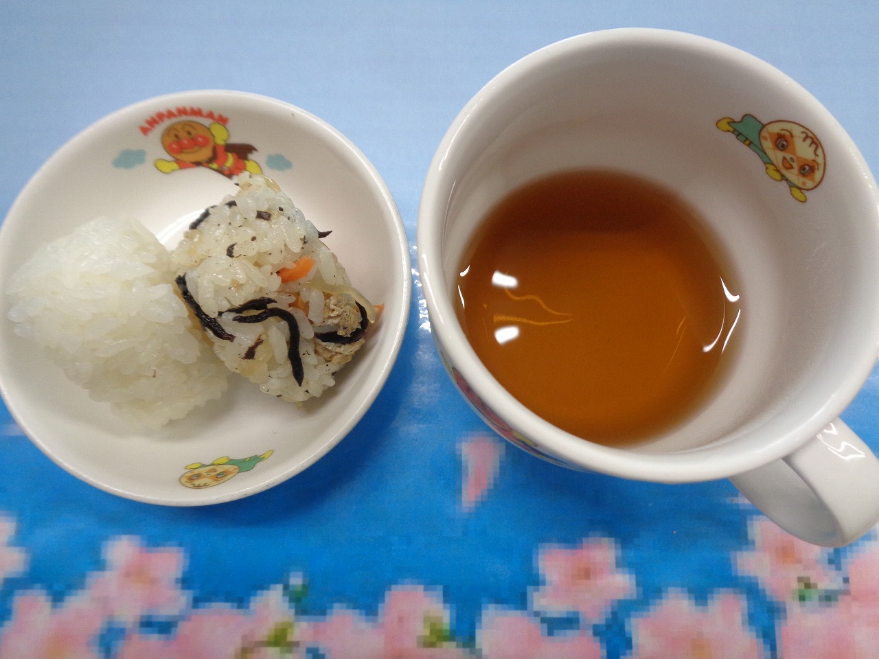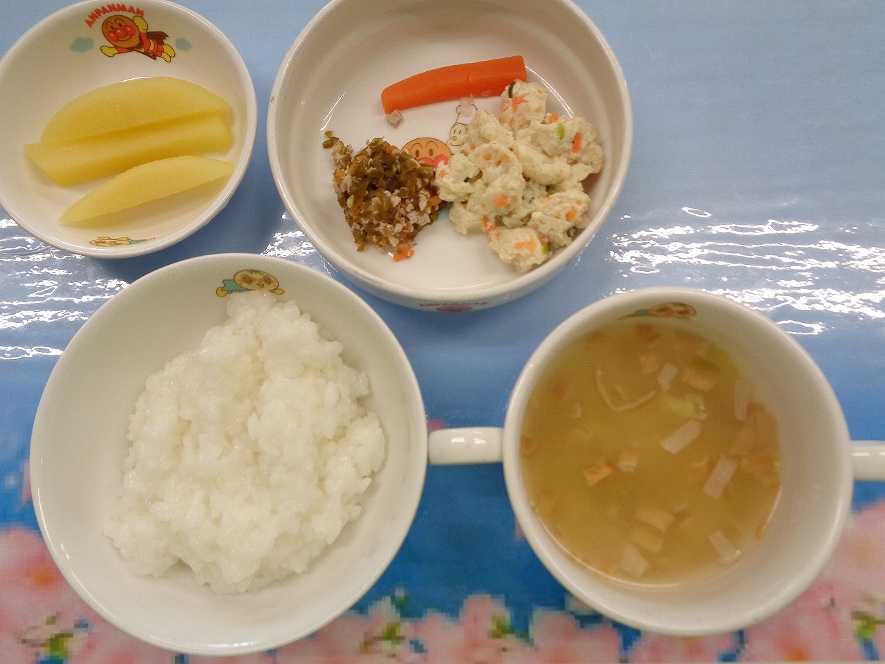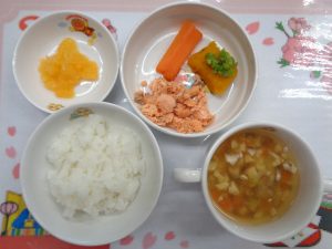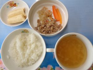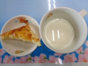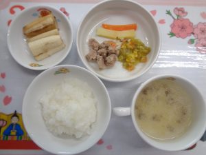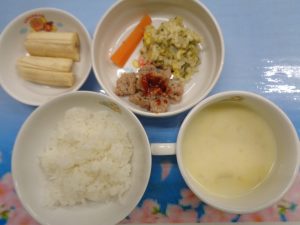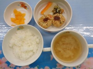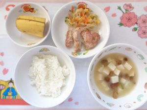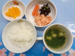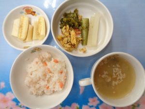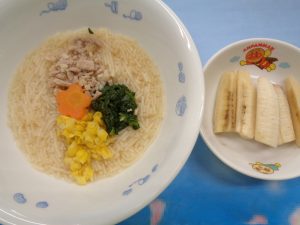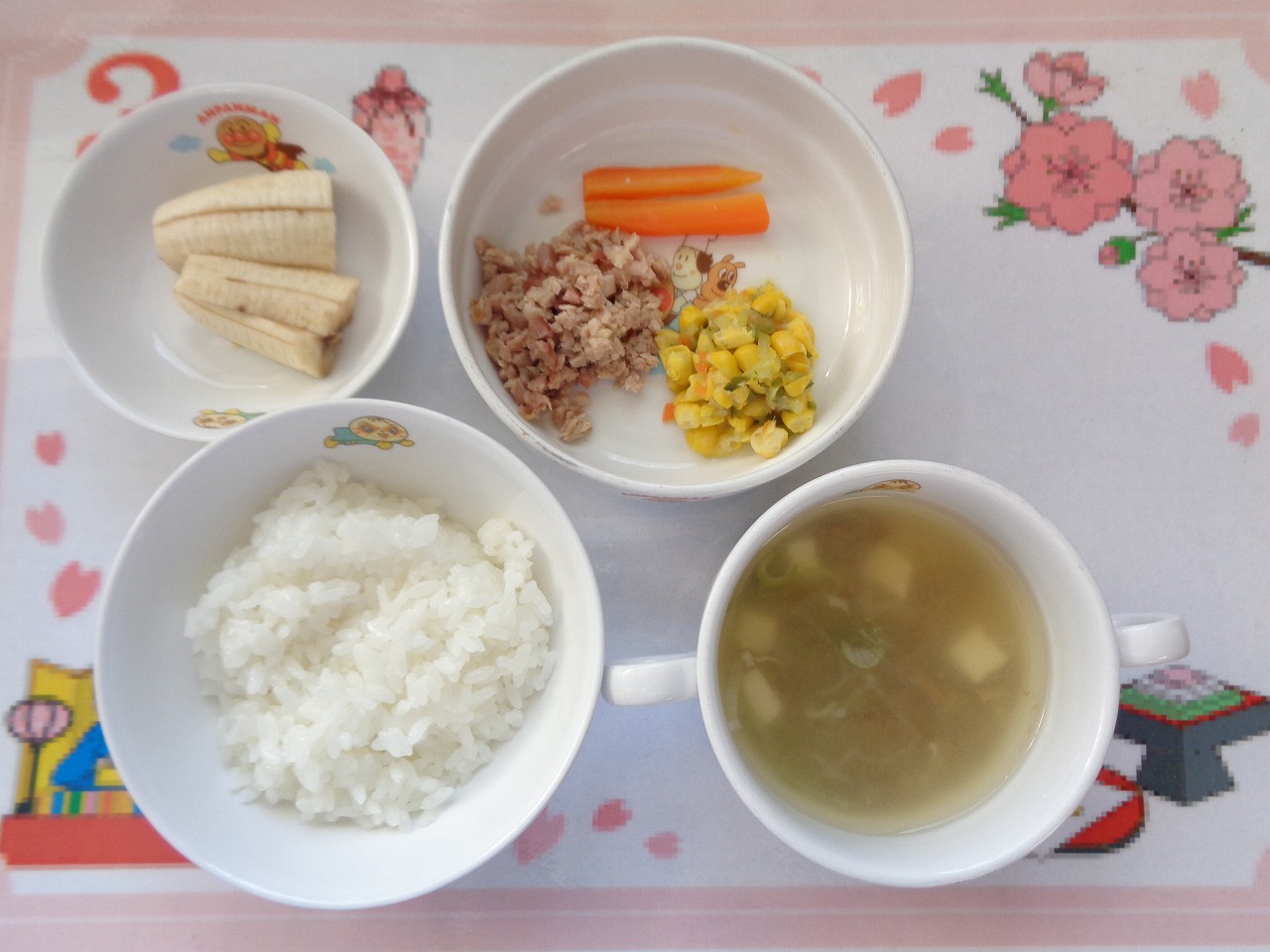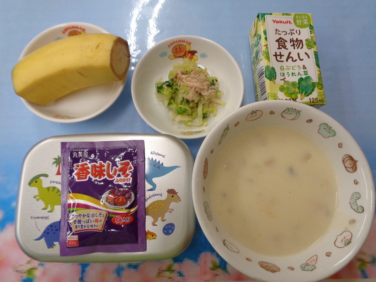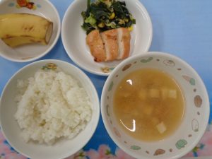 19日の給食は『おにぎり(鮭・わかめ)・五目卵焼き・ゆかり和え・豚汁・ヨーグルト』で、おやつは『チョコバナナ・麦茶』でした🍙