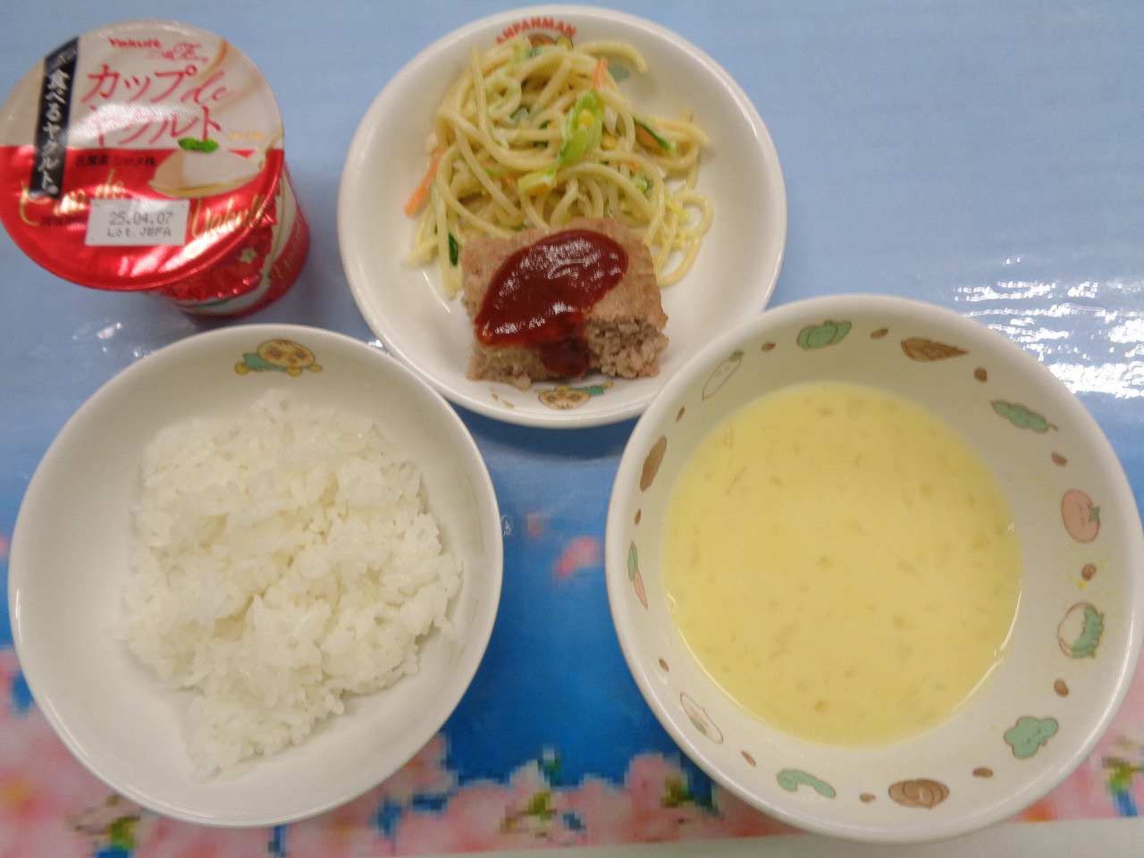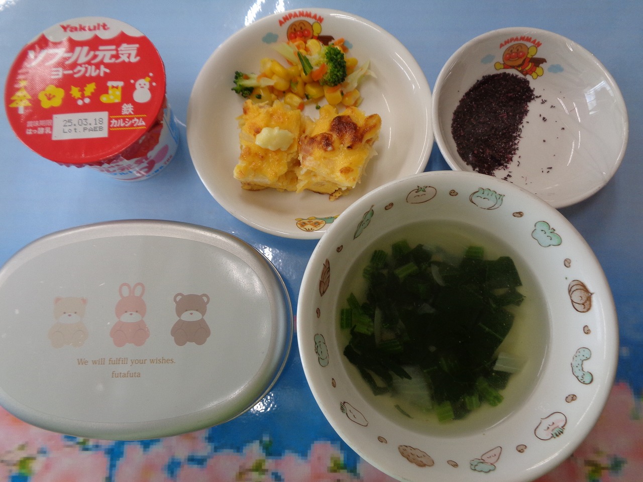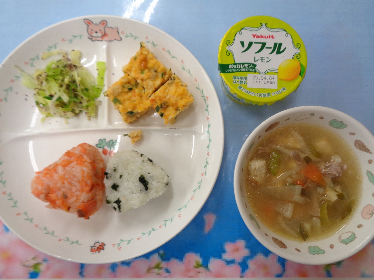 4日の給食は『スパニッシュオムレツ・ブロッコリーサラダ・野菜スープ・ゆかり・ヨーグルト』で、おやつは『ひじきおにぎり・つや姫塩おにぎり・麦茶』でした🍙