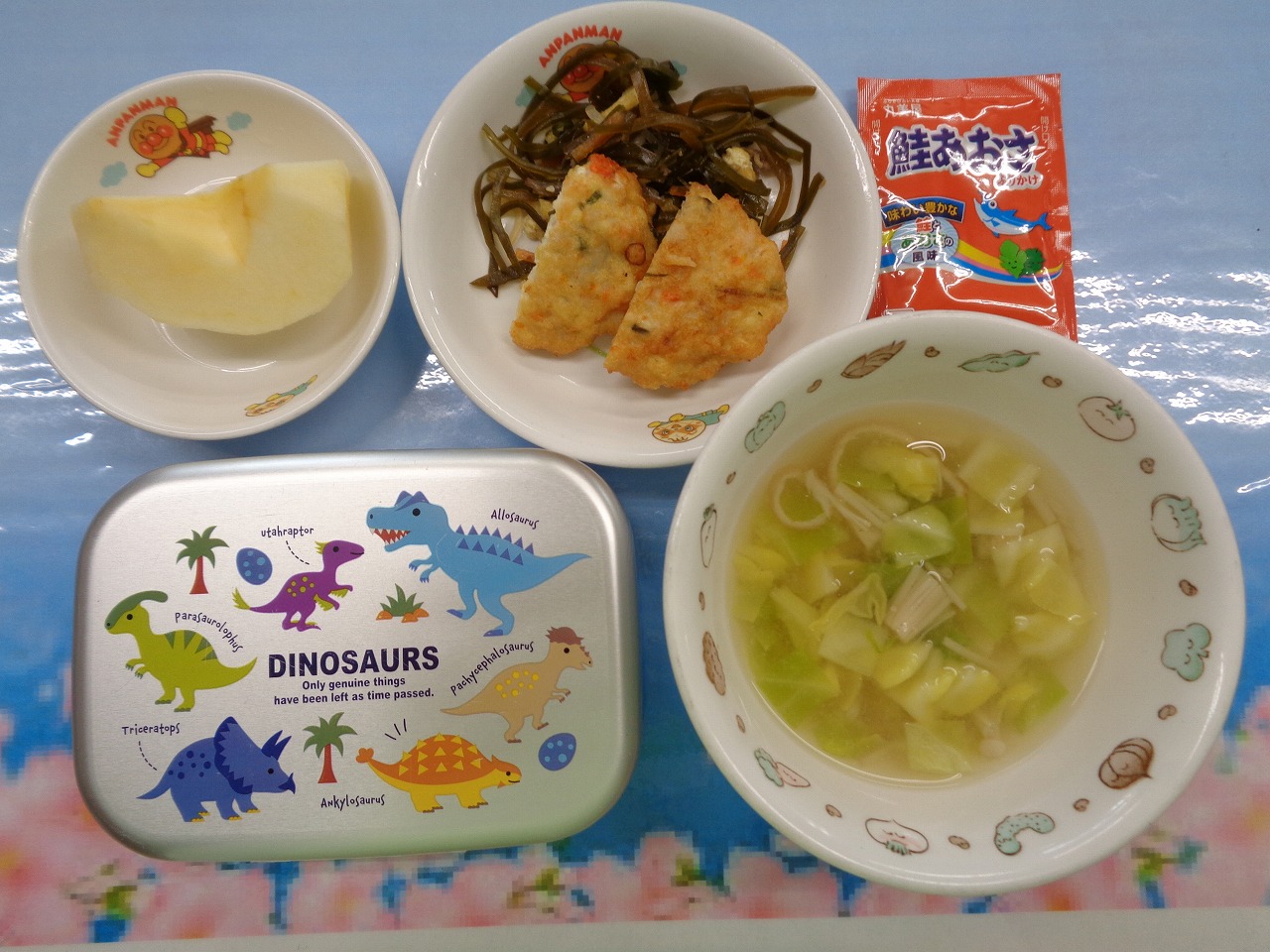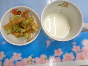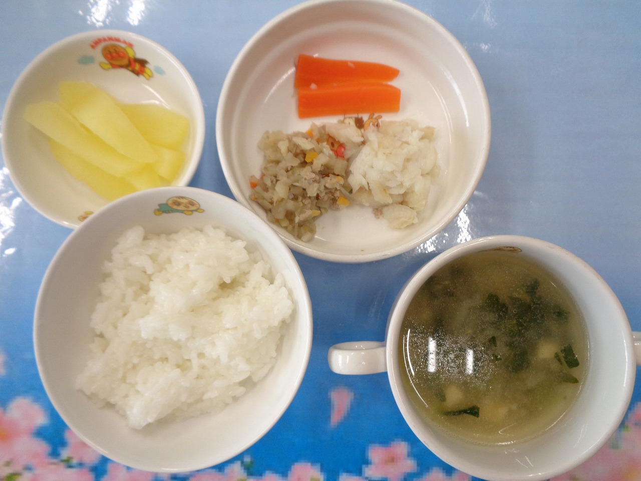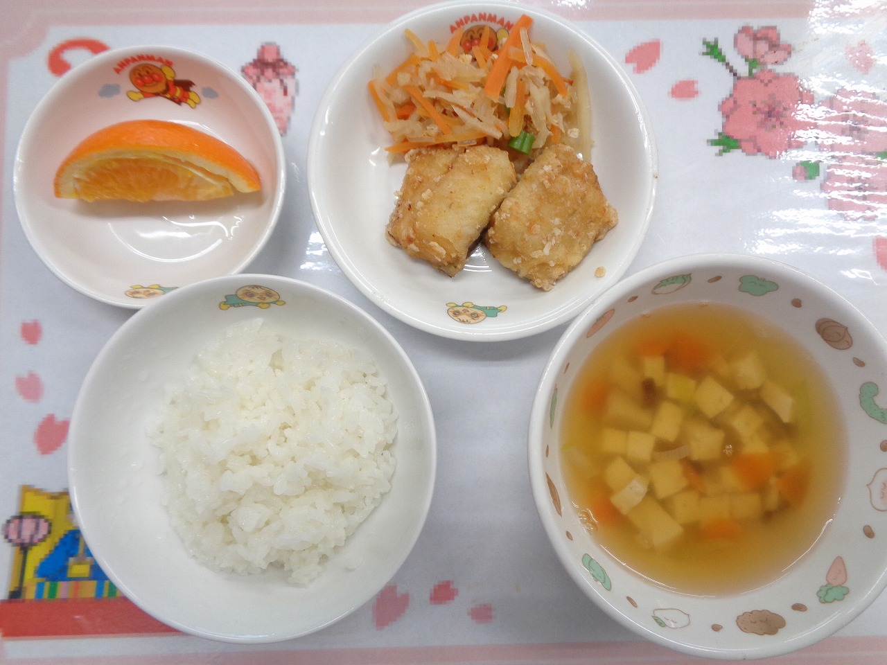 5日の給食は『さわらのカレー揚げ・切干大根煮・けんちん汁・いよかん』で、おやつは『いちご蒸しパン・牛乳』でした🐟