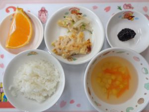 7日の給食は『マカロニグラタン・こぎつね和え・のりの佃煮・三食スープ・デコポン』でした🐔