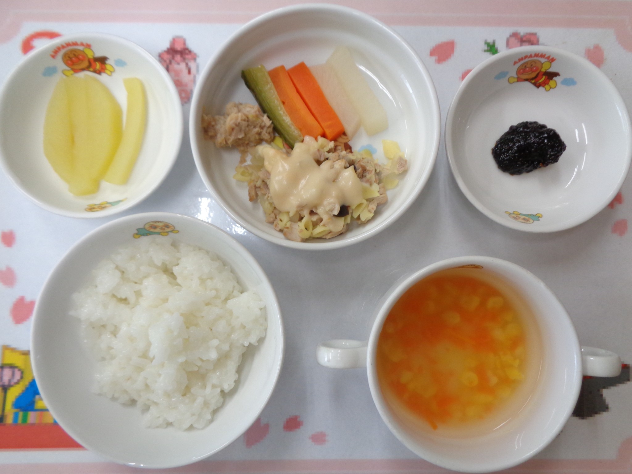 21日の給食は『コーンシチュー・ツナサラダ・ふりかけ・野菜ジュース・バナナ』でした🍌
