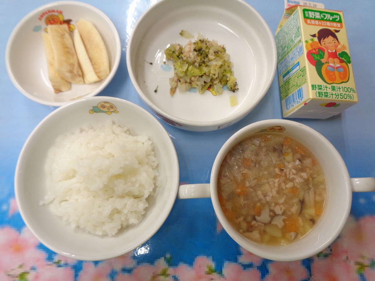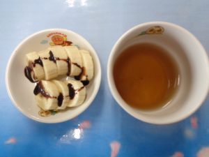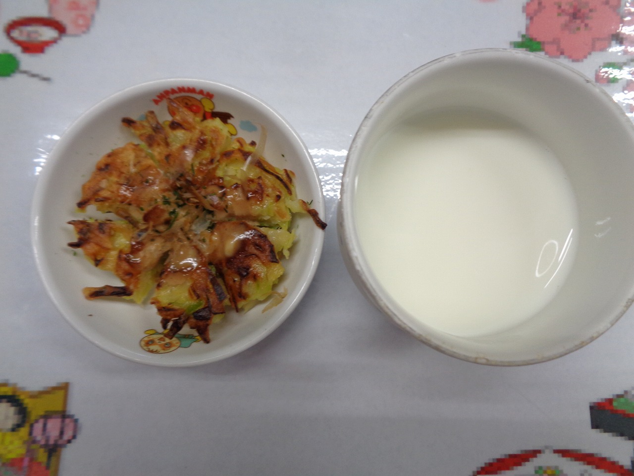 11日の給食は『ガーリックチキン・切り干し大根サラダ・なめこ汁・バナナ』で、おやつは『お好み焼き・牛乳』でした🍌