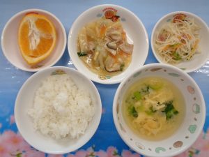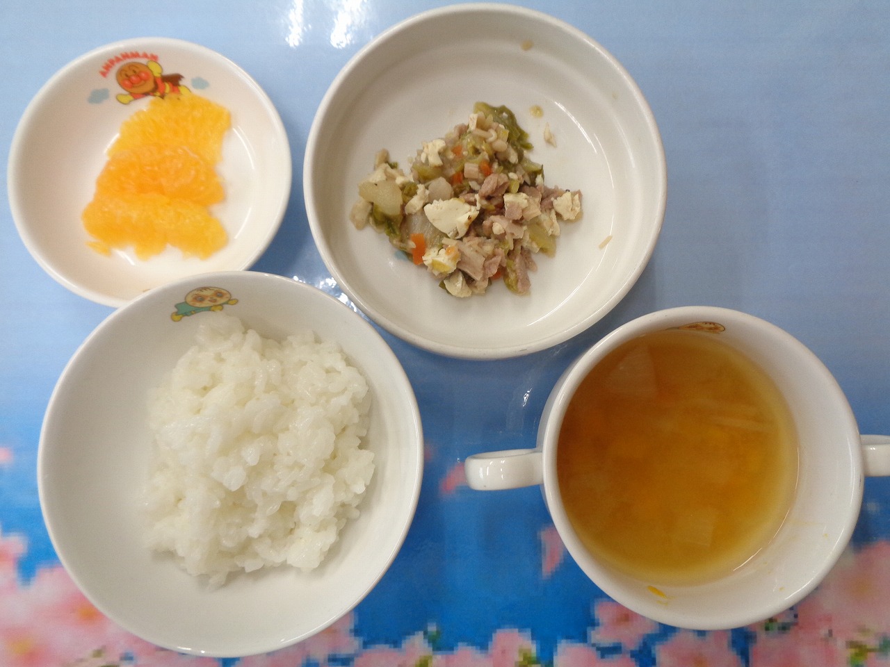 12日の給食は『八宝菜・ビーフンソテー・かきたま汁・いよかん』で、おやつは『アップルパイ・牛乳』でした🍊