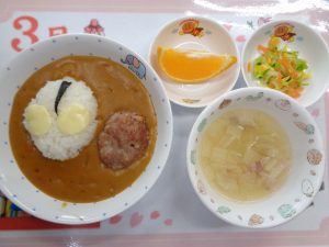 13日の給食は『チーズハンバーグカレー・コールスロー・白菜スープ・デコポン』で、おやつは『フライドポテト・牛乳』でした🍊