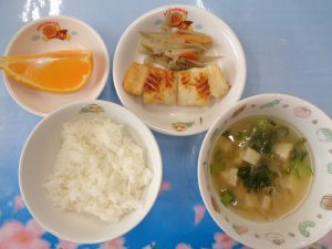 14日の給食は『カレイの梅焼き・五目きんぴら・みそ汁(もやし・小松菜・厚揚げ)・デコポン』でした🐟