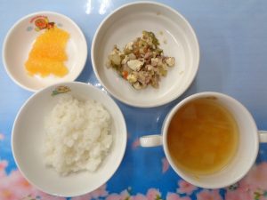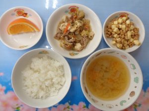 17日の給食は『すき焼き風煮・チーズ納豆・みそ汁(かぼちゃ・玉ねぎ)・いよかん』でした🐷