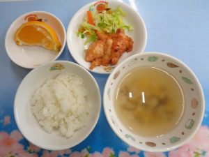 27日の給食は『鶏のマーマレード焼き・わかめサラダ・みそ汁(厚揚げ・大根・椎茸)・バナナ』でおやつは『プリン』でした🐔