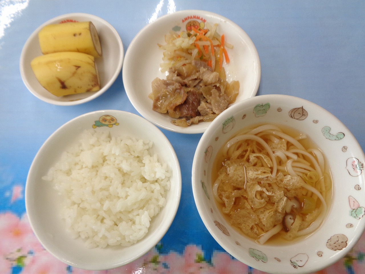 24日の給食は『豚肉の生姜焼き・うるいのごま和え・うどん汁・バナナ』」でした🍌