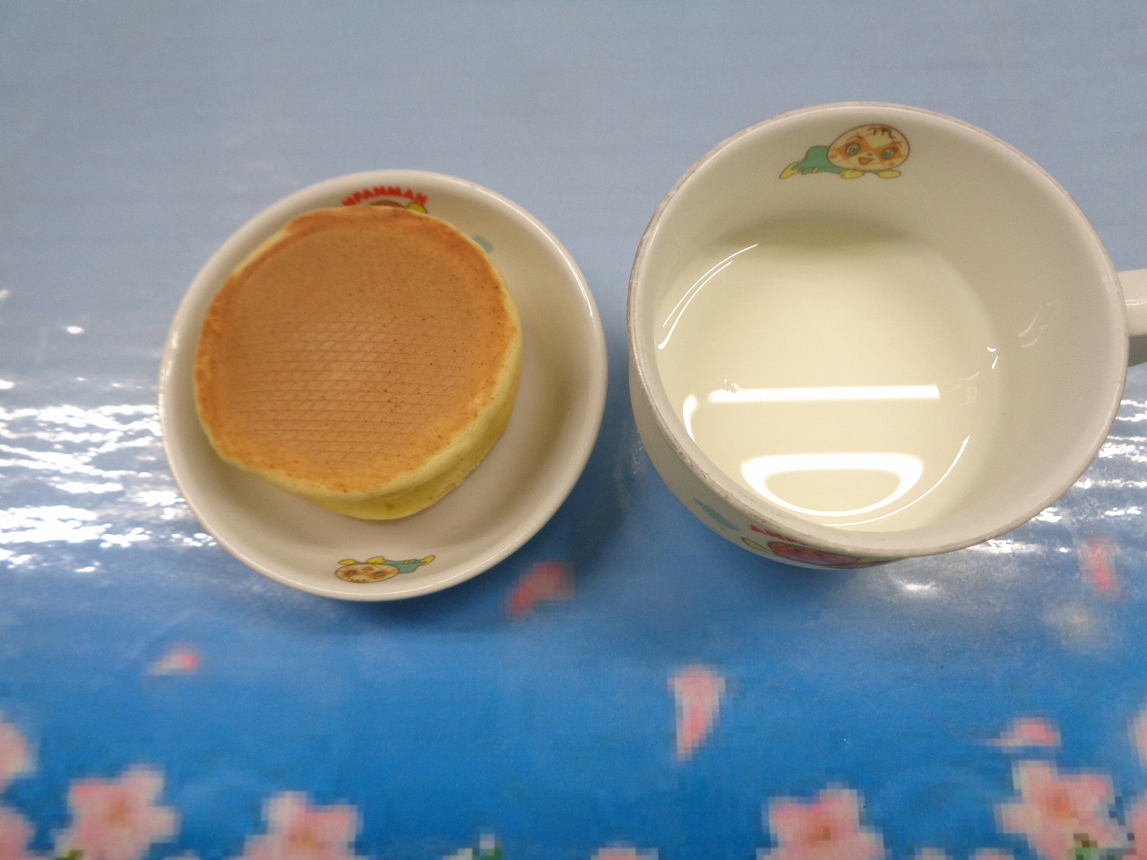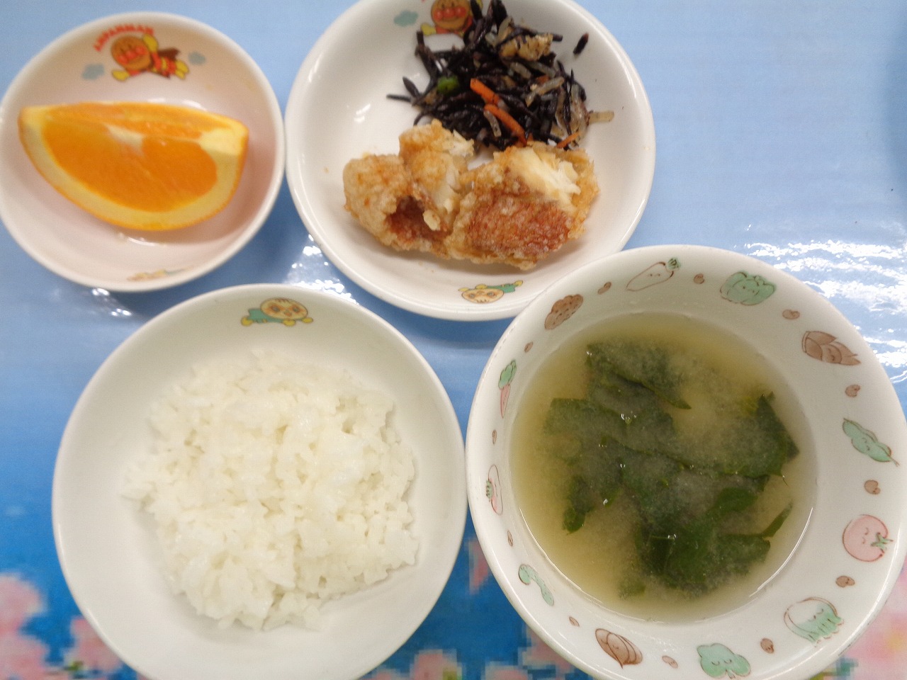 25日の給食は『赤魚の甘辛揚げ・ひじきの炒め煮・みそ汁(じゃが芋・ほうれん草)・オレンジ』で、おやつは『どら焼き・牛乳』でした🐟