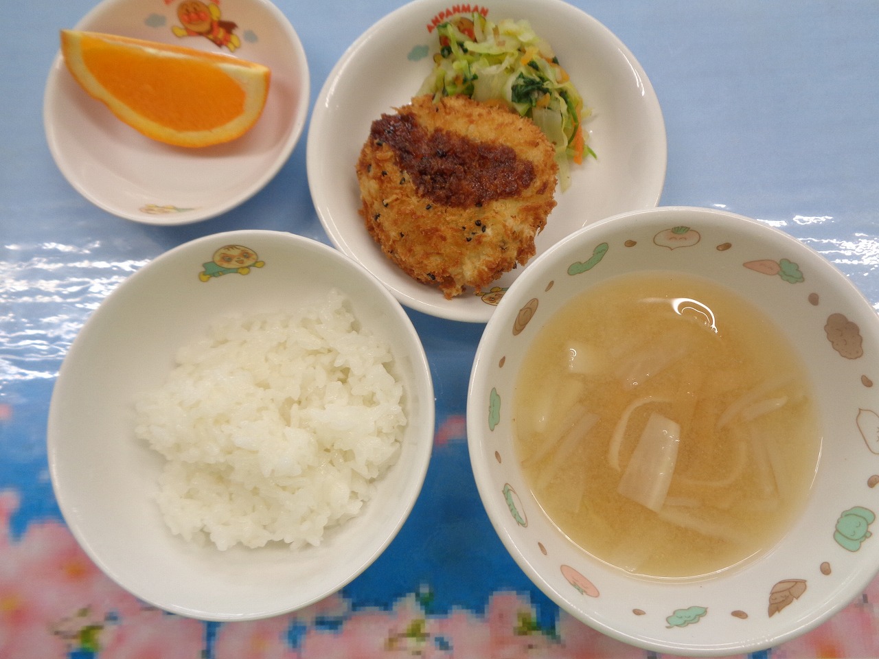 31日の給食は『さつま芋コロッケ・おかか和え・ふりかけ・みそ汁(大根・焼き麩もやし)・オレンジ』でした🍊
