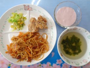 7日の給食は『ナポリタン・鶏の唐揚げ・コーンサラダ・玉ねぎスープ・フルーチェ』でした🐔
