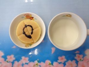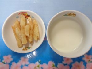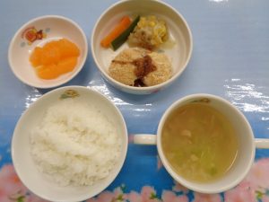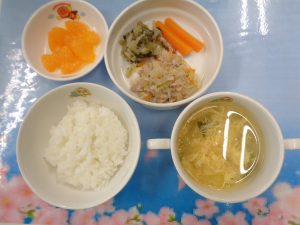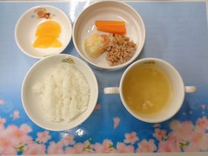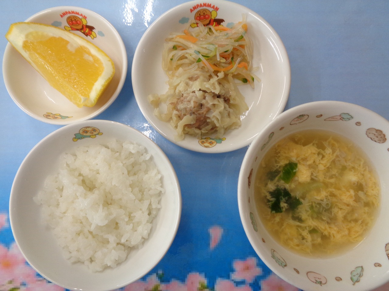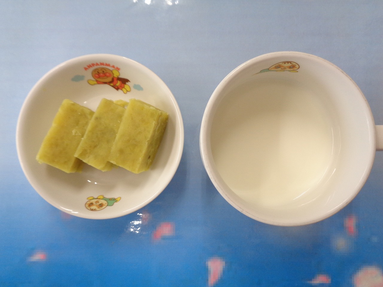 8日の給食は『しゅうまい・春雨サラダ・卵スープ・ジューシーフルーツ』で、おやつは『芋ようかん・牛乳』でした🥚